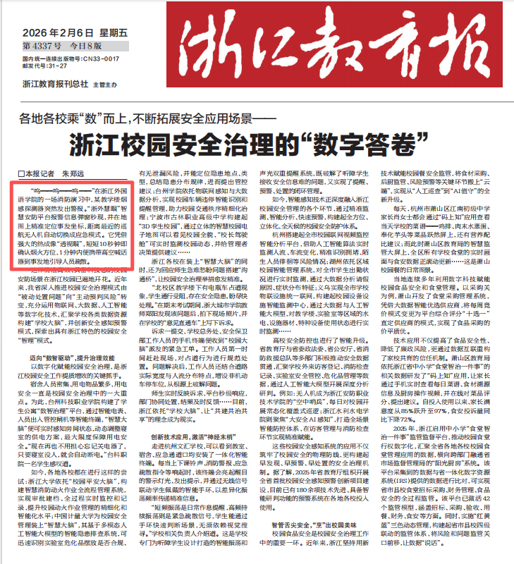 2月6日,浙江教育报头版头条以“各地各校乘‘数’而上,不断拓展安全应用场景——浙江校园安全治理的‘数字答卷’”为题,报道了具有浙江特色的校园安全“智理”模式。其中特别提到了我校“浙外慧眼”智慧安防平台的治理模式。