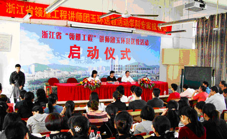 为了加强对“领雁工程”骨干培训工作的指导和服务,有效地缓解各地培训师资不足的矛盾,逐步形成优质培训师资全省共享机制,确保“领雁工程”的实施质量和效果,浙江省教育厅于2009年6月成立了浙江省农村中小学教师“领雁工程”讲师团。本次赴玉环送教的讲师团包括了来自了浙江师范大学、省教研室、富阳郁达夫中学以及我校等单位的数十位名师与专家。讲师团采用省名师和当地名师同课异构、专家点评及专家讲座等形式认真开展送教活动,为当地教育送去了先进的教学理念和方法。