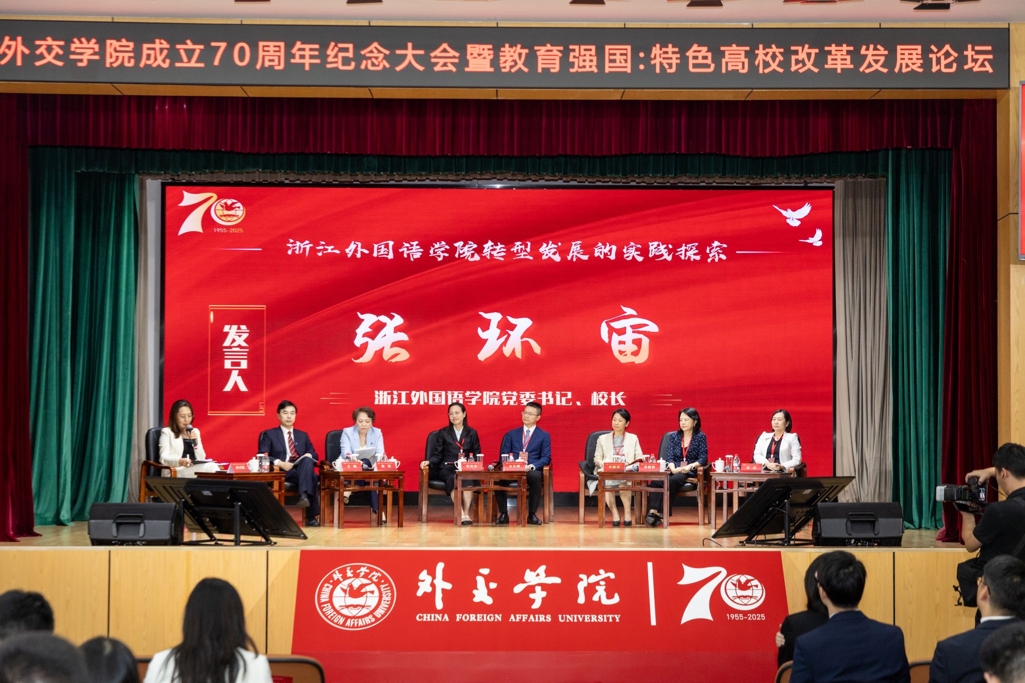 张环宙代表学校祝贺外交学院70周年华诞,并以“浙江外国语学院转型发展的实践探索”为题,阐述了浙外立足服务国家战略和浙江高能级开放强省需求、应对人工智能带来的挑战以及高等教育强国建设的时代要求,在人才培养模式改革、学科建设机制创新、开放合作网络构筑等方面,推动学校转型发展的探索与实践。她强调,开放合作对学校来说具有独特意义,浙外的诞生是与北外合作的重要成果,浙外的转型得到了北大的合作支持,浙外的未来也会是开放合作的鲜活样本。她对兄弟院校的支持与帮助表示感谢,真诚期待与更多高校紧密合作,同时诚挚邀请各位领导、专家莅临指导浙外建校70周年高质量发展大会。