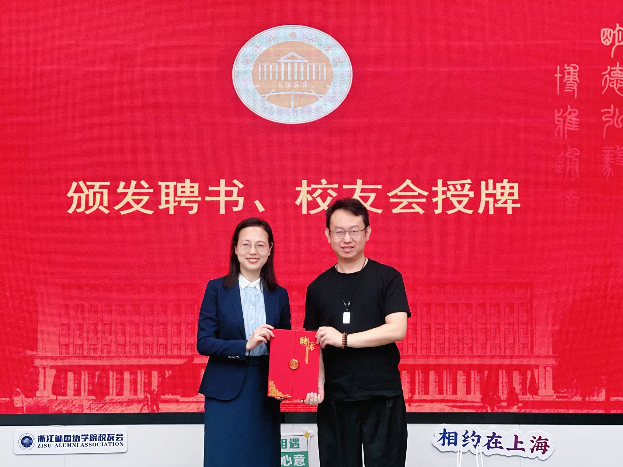 张环宙代表学校为上海校友会授牌,同时为2005届计算机科学与技术专业校友、梦饷科技创始人王敏颁发“浙江外国语学院校友之家”证书,希望这里成为校友们常相聚、常交流的平台。