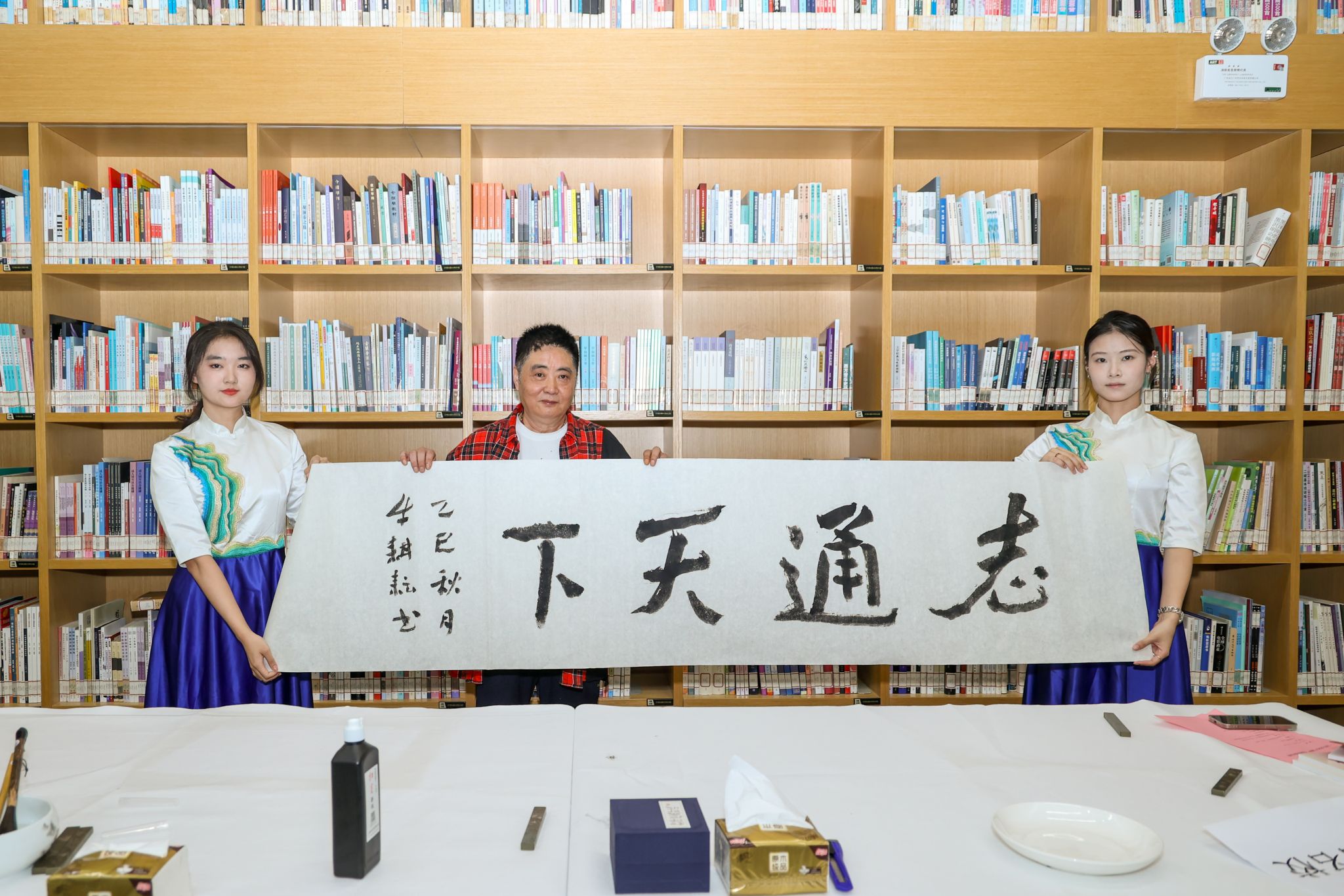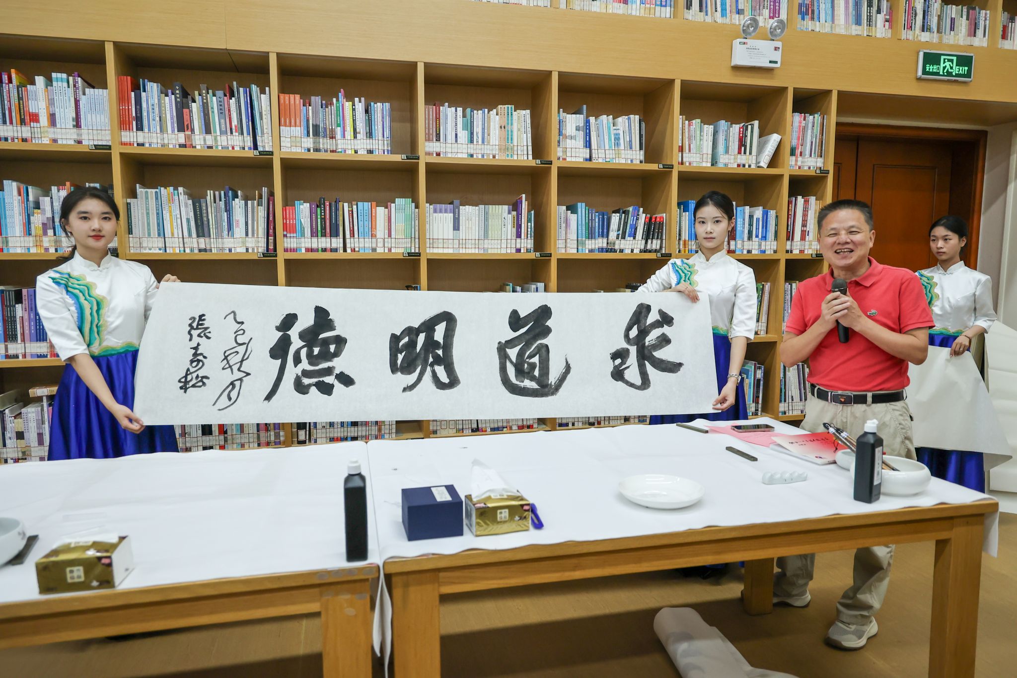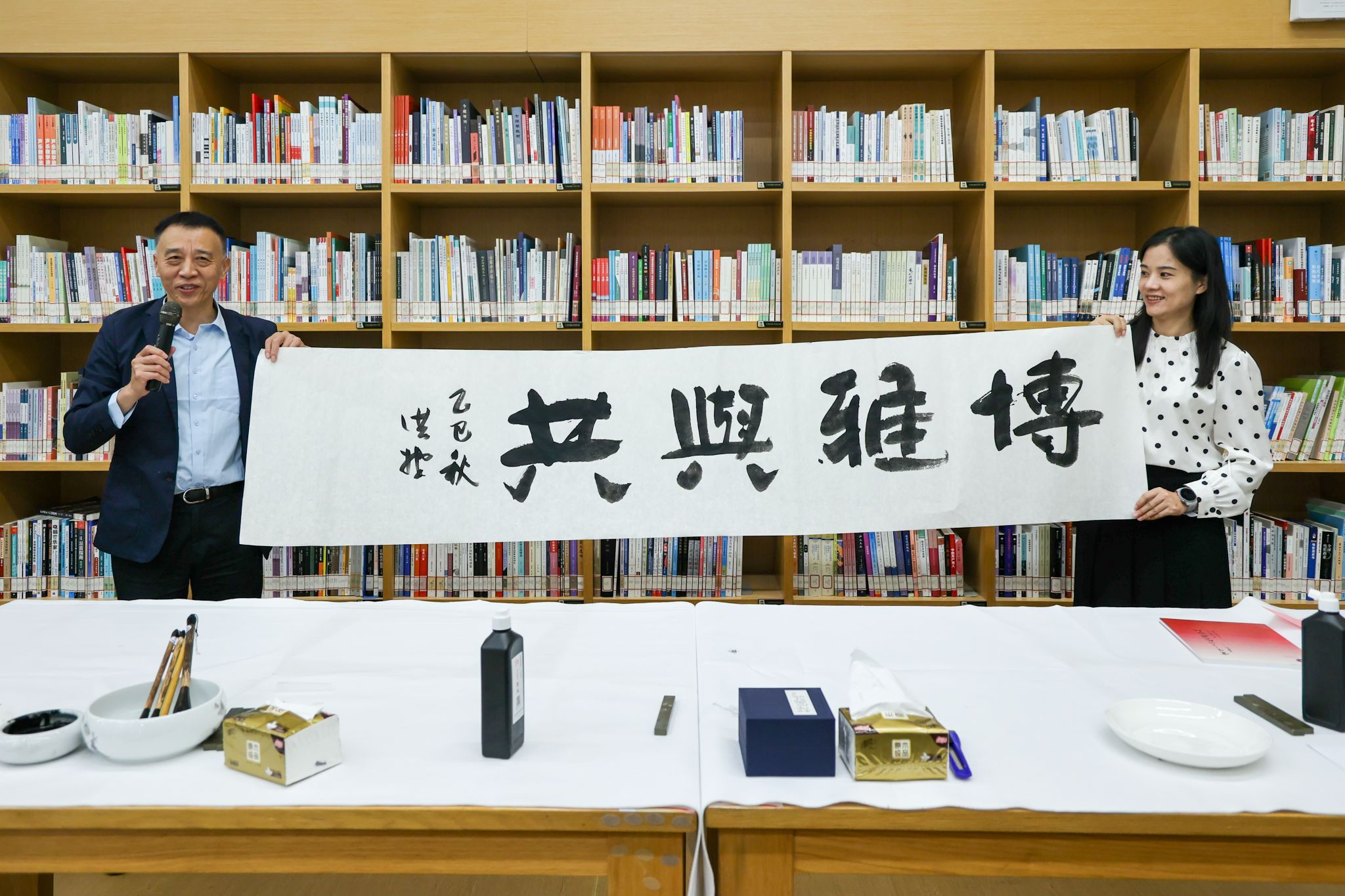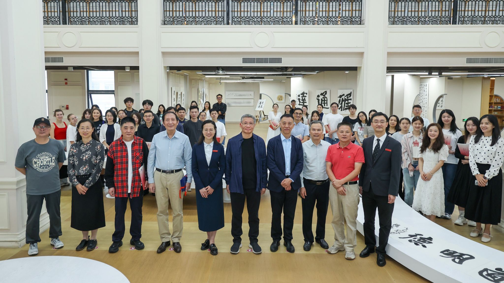 现场,陈洪捷教授、牛耕耘教授率先挥毫,笔墨流转间,“博雅与共”“志通天下”等作品渐次成型,尽显品格;随后,宣勇教授、张寿松教授接续创作,以苍劲笔力书写“兼容并包”“求道明德”,作品间交相呼应,彰显风骨。四位嘉宾的即兴创作引得现场掌声不断,让师生直观感受传统书法“静态之美”与“动态之灵”的交融。