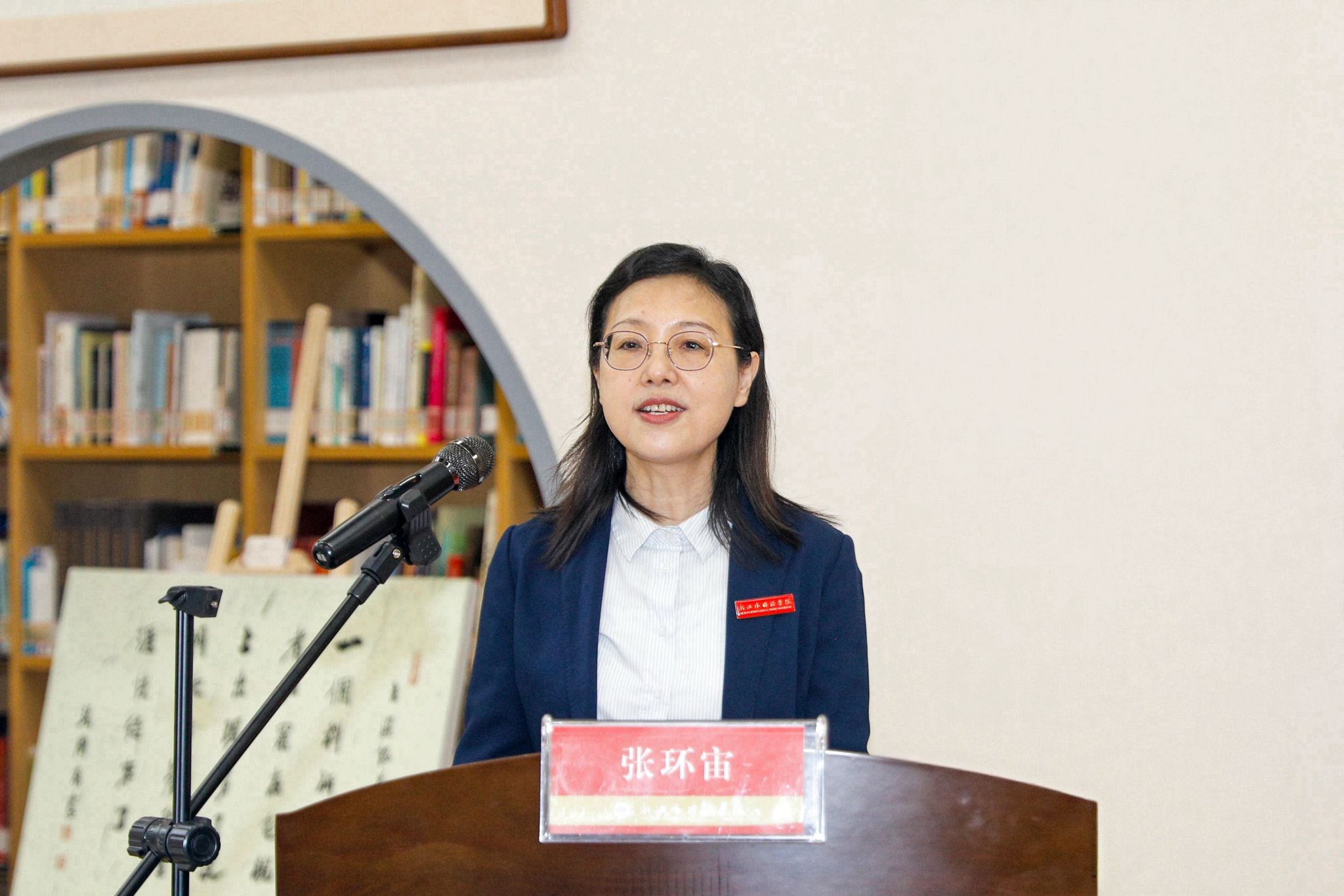 张环宙在致辞中表示,本次展览是浙外建校70周年系列文化活动的重要组成部分,不仅是一场艺术盛宴,更是一次南北高校间的文化对话,不仅是笔墨技艺的展现,更是两校师生对文化传承的责任担当。张环宙代表学校向北京大学及各地高校同仁、各界朋友及筹展教师致以诚挚感谢。她指出,北大与浙外虽地处南北、定位不同,但在“以文化人、以文育人”的教育理想上志同道合。北大以深厚底蕴涵养思想,浙外以国际视野传播文明,北大的哲思深度与浙外的国际广度,在宣纸上相遇、对话、共鸣,让中华优秀传统文化在新时代焕发出蓬勃生机。她期待以展览为契机,继续推动北大、浙外两校在文化传承与创新领域深度合作,携手为中华优秀传统文化的弘扬注入新的活力。