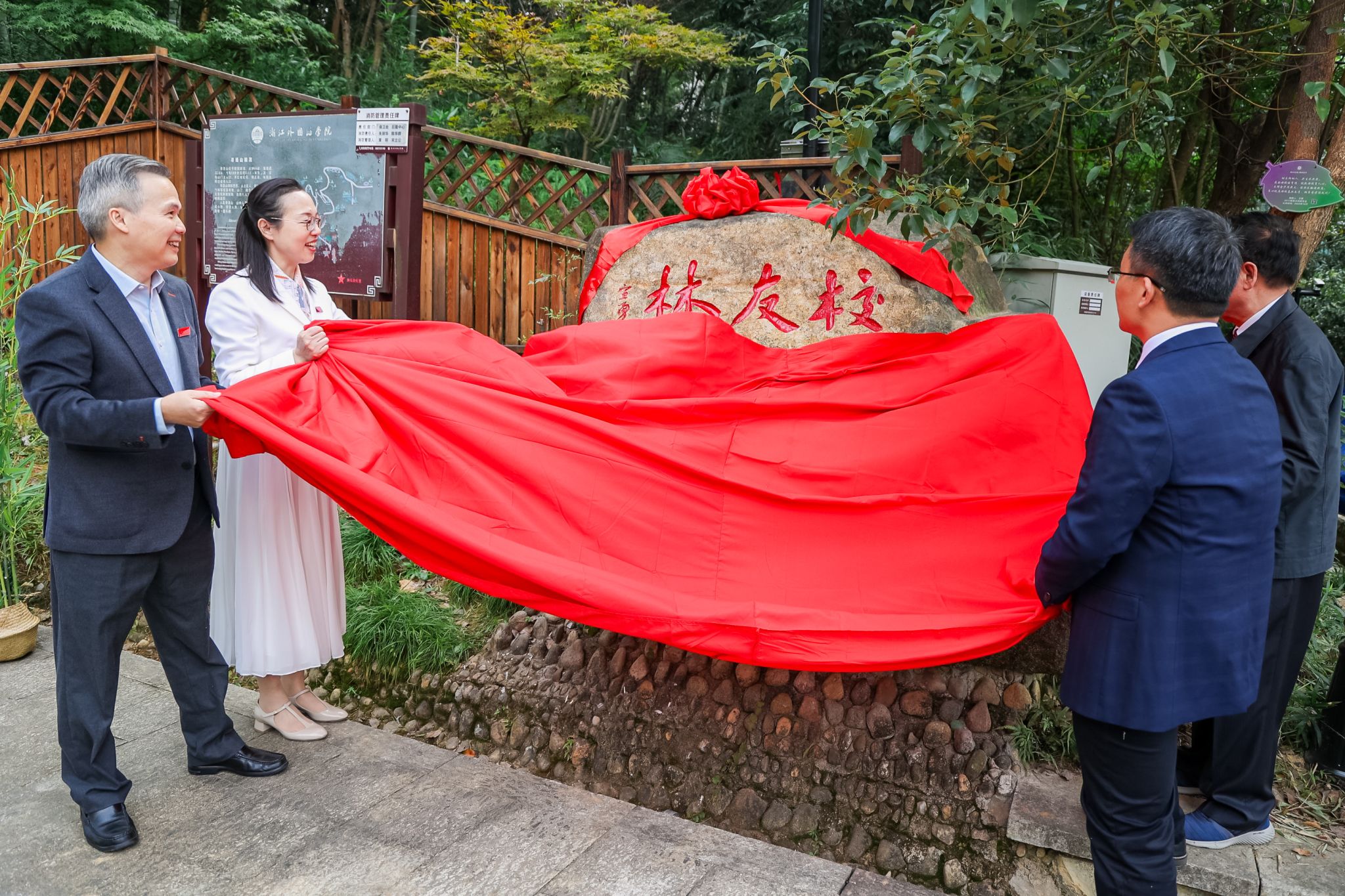 张环宙、毛振华、赵文波、胡浙平为浙江外国语学院“校友林”揭牌。