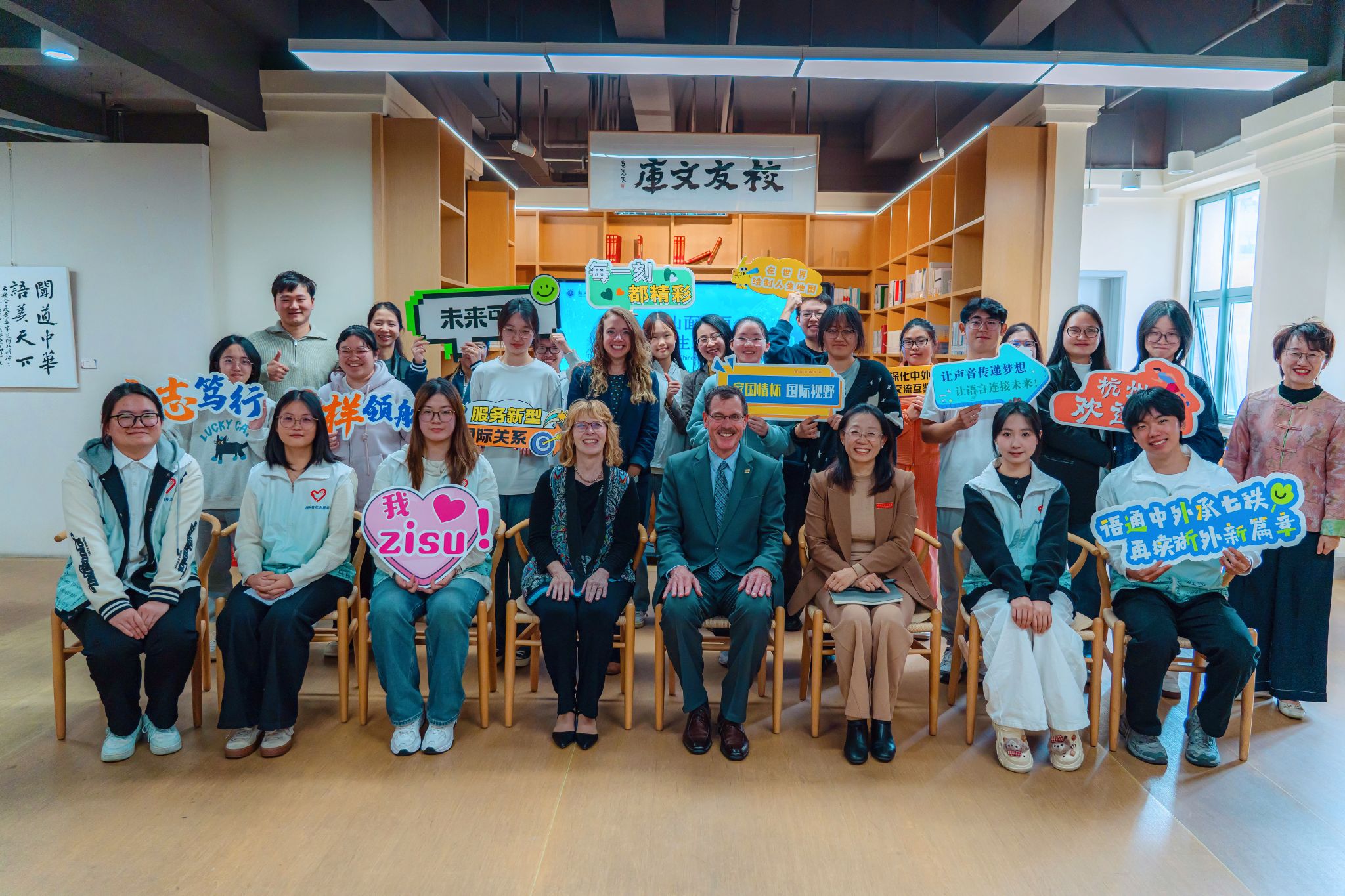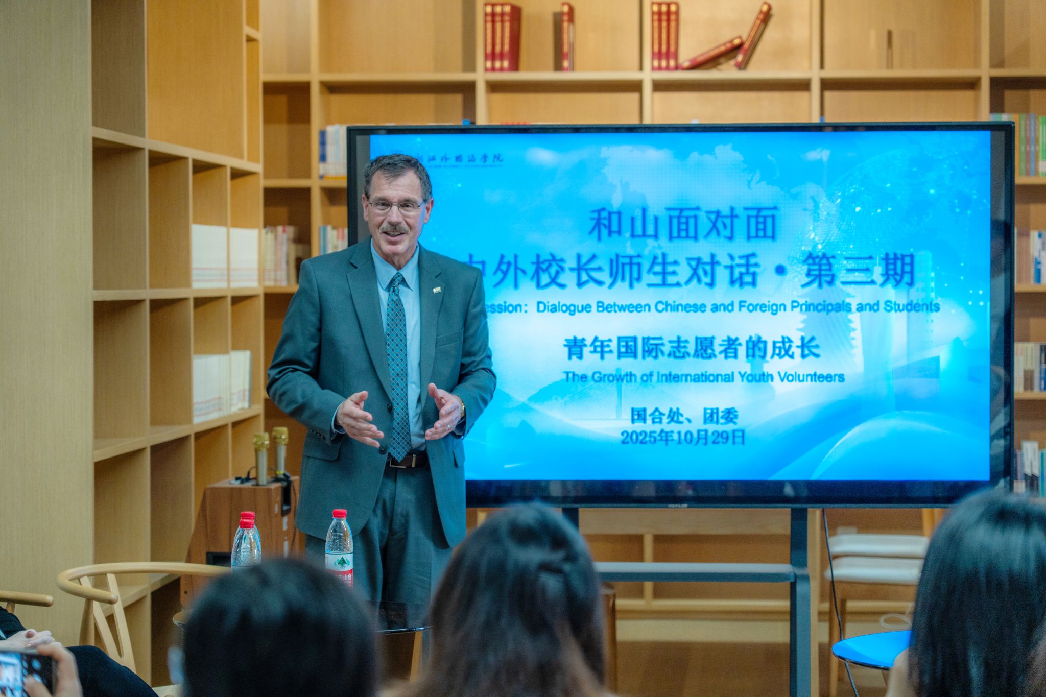 秋光映室,思想共鸣。10月29日,“和山面对面:中外校长师生对话”第三期活动在弘文馆举行。美国密苏里南方州立大学校长迪恩·范盖伦及其夫人玛丽·范盖伦应邀出席,与第五届全球外国语大学联盟校长论坛志愿者代表座谈交流,共话青年国际志愿者成长与担当。我校副校长、党委委员柴改英出席活动。