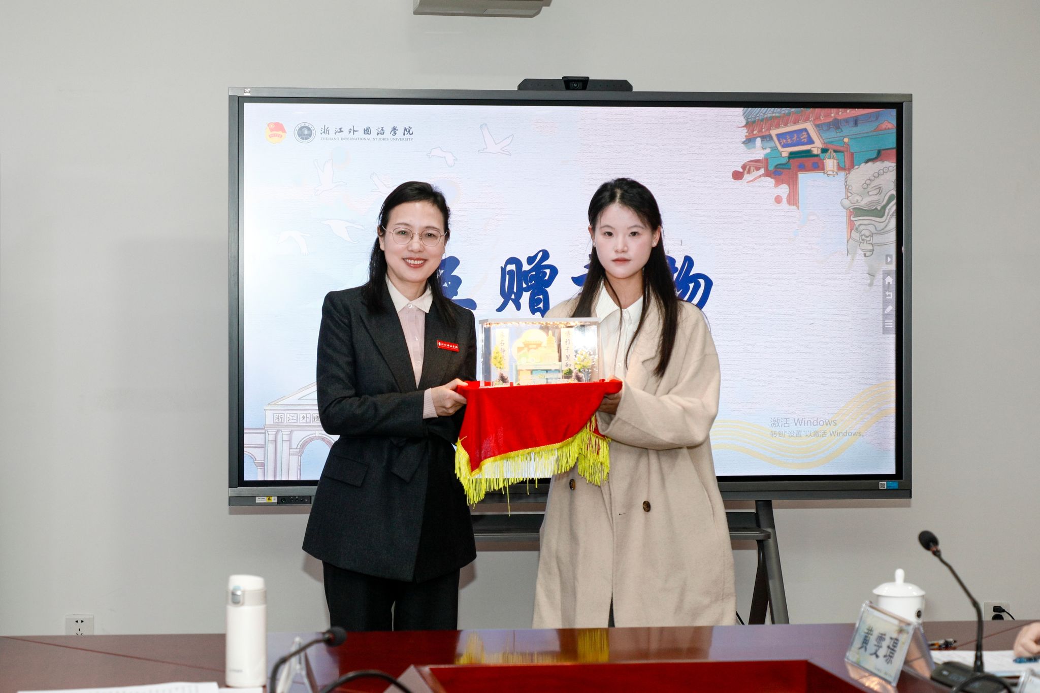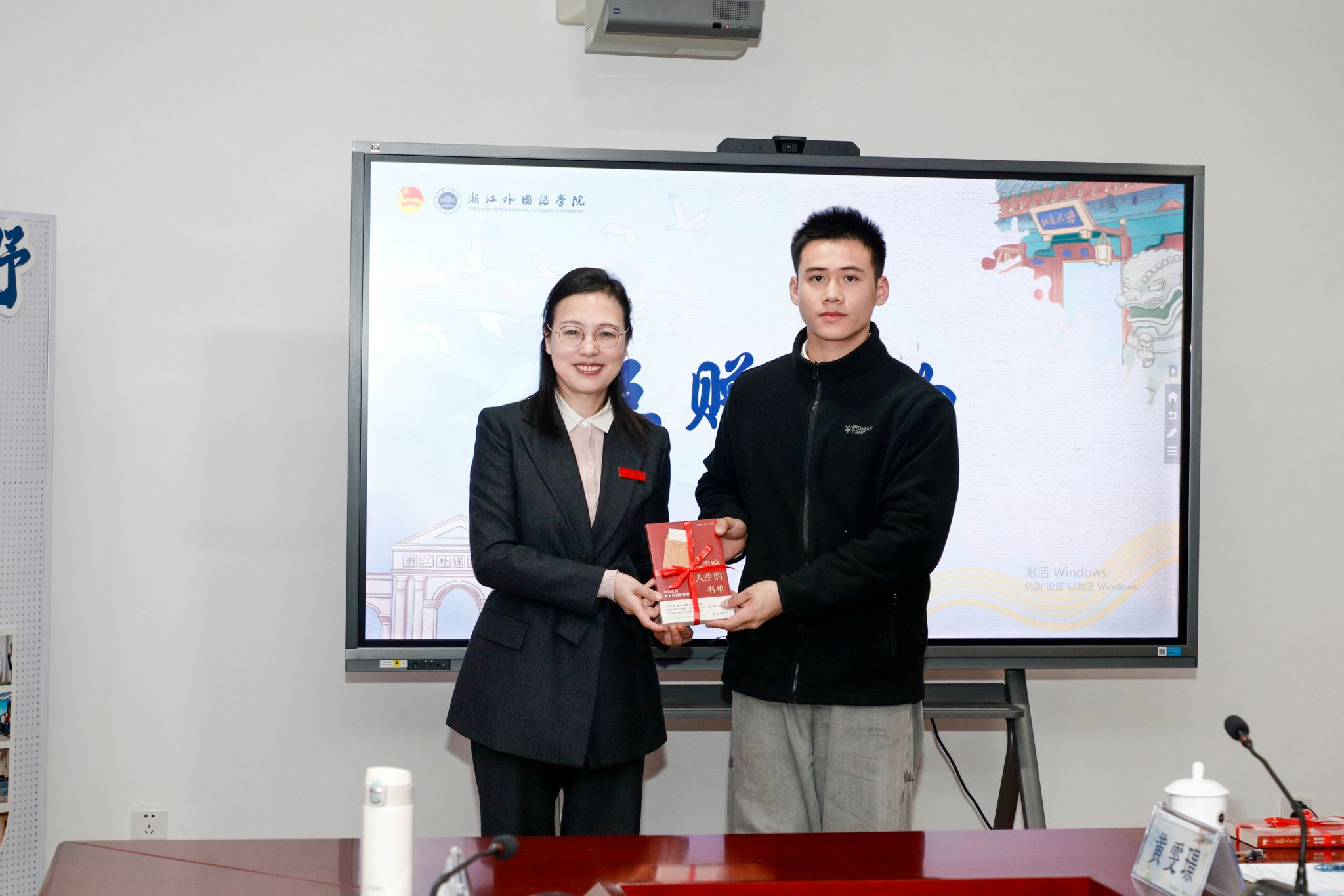 交流会尾声,张环宙向同学们赠送百位北大教授推荐的《影响人生的书单》,鼓励大家在静思湖畔好读书,在书籍中找到人生成长的答案。学生代表向张书记赠送自行设计制作的“‘北大-浙外’合作”文创,以日期定格合作日,以万年历寓意合作长长久久的美好祝福。