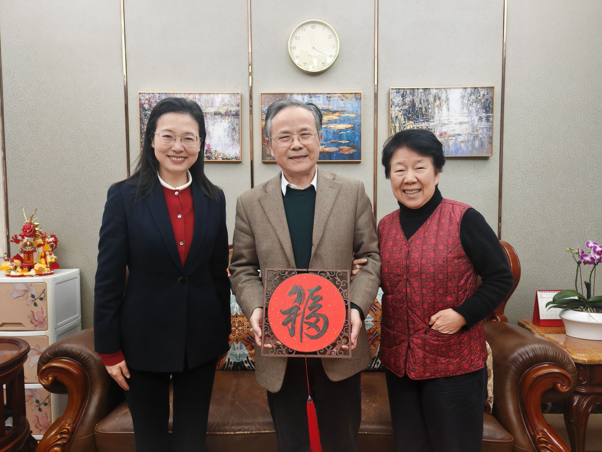 1月20日,张环宙看望慰问了原校党委书记姚成荣。张环宙与老领导及家属促膝长谈,了解他们近期身体、生活等情况,并向老领导介绍了学校事业发展情况,以及学校围绕国家战略需求和地方经济社会发展,在人才培养、学科建设、科学研究、社会服务等方面实现的新突破,展望了学校“十五五”发展的宏伟蓝图。张环宙希望老领导一如既往关心学校改革与发展,为学校各项工作多提宝贵意见,并将学生书写的福字赠予老领导及其家人。