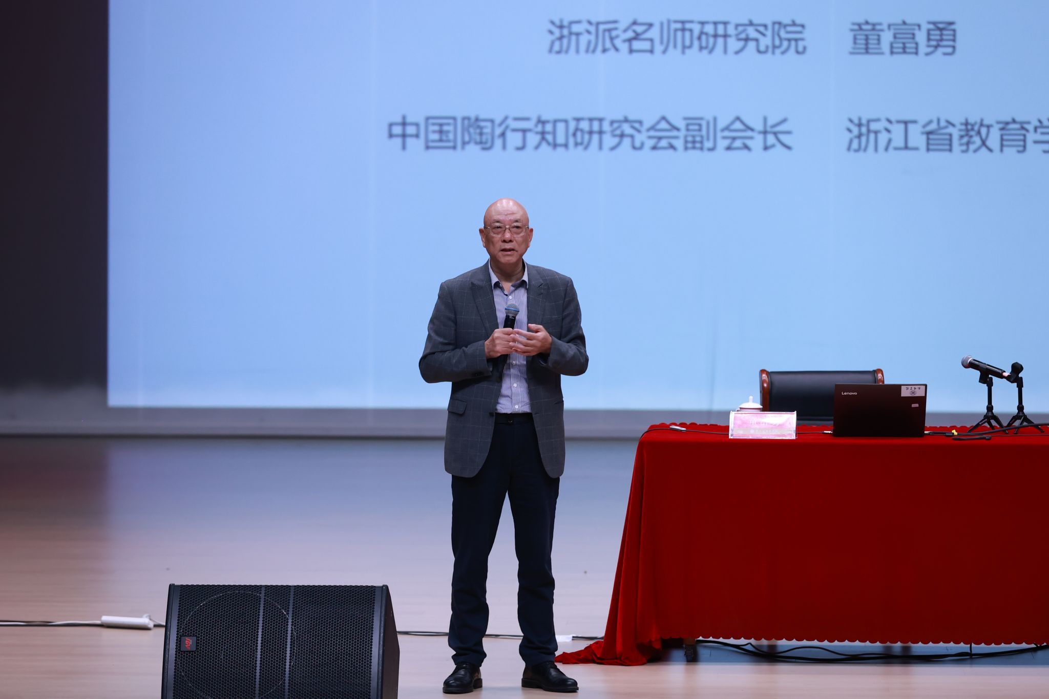童富勇以《弘扬行知精神,做新时代的大先生》为题,指出陶行知思想具有鲜明的时代价值,实验学校应与人工智能时代教育实践相结合,聚焦核心主题深耕课程与教学,推动陶行知思想与当下教育改革深度融合并争创教学成果。