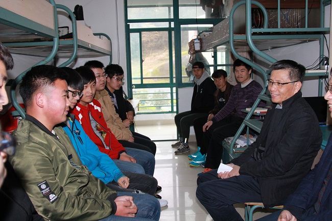 宣勇与同学们逐一交流,寝室里不时响起掌声和欢笑声。他强调,大学生们应该牢固树立矢志不渝的理想信念,在中华民族伟大复兴中国梦的实践中放飞青春梦想。宣勇还逐一详细询问了同学们今后的人生规划。学生李海洋分享道:“习近平积极为民的服务精神,告诉我们要深入群众,深入实际,我的规划是考基层公务员,以改变自己家乡为起点!”学生闻国金说:“习近平在知青岁月时,每天熬夜看书,我们学习语言的,就需要这种精神,从这个学期开始,我已经加入了晨读行动,虽然没有早课,我也要坚持每天早起读书,希望最后能够去实现自己环游世界的梦想!”……宣勇认真细致地倾听每位同学的成长规划,不时给出自己的建议和指导。他提议,寝室里要多组织集体活动,每位同学都要珍惜大学的美好生活。