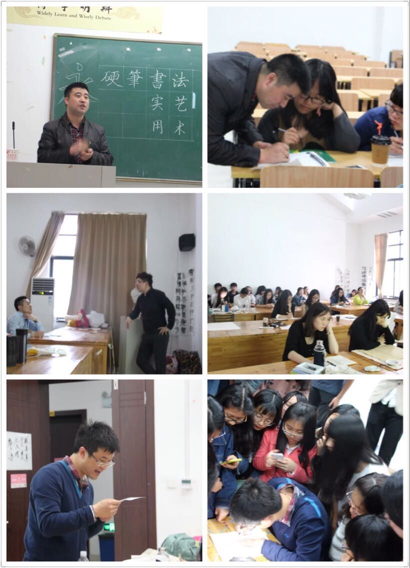 为进一步凝练艺术教育中的社团文化特色,凸显民族民间韵味,近日,艺术学院举办了“新常态新气象”书法篆刻系列讲座。讲座分别邀请杭州市青少年活动中心硬笔书法教师王耀龙、任伯年艺术研究院特聘画师杨少峰、艺术学院教师孟磊担任主讲。王耀龙以“硬笔与粉笔字书写规范”为主题,从握笔姿势、笔画的具体写法、字的风格特征、碑帖选择等方面一一示范讲解;杨少峰以“篆刻赏析及汉印摹刻”为主题,从商周以来各个朝代不同的篆刻特点,到篆刻的刚与柔、直与曲、方与圆,带来了一场篆刻艺术盛宴;孟磊以“杨守敬对日本近代书风的影响”为主题,讲述了清中后期、日本明治维新时期的文化、艺术演变进程,着重解析了杨守敬将金石考据学研究方法与对碑版的尊崇传至近代日本的历程。