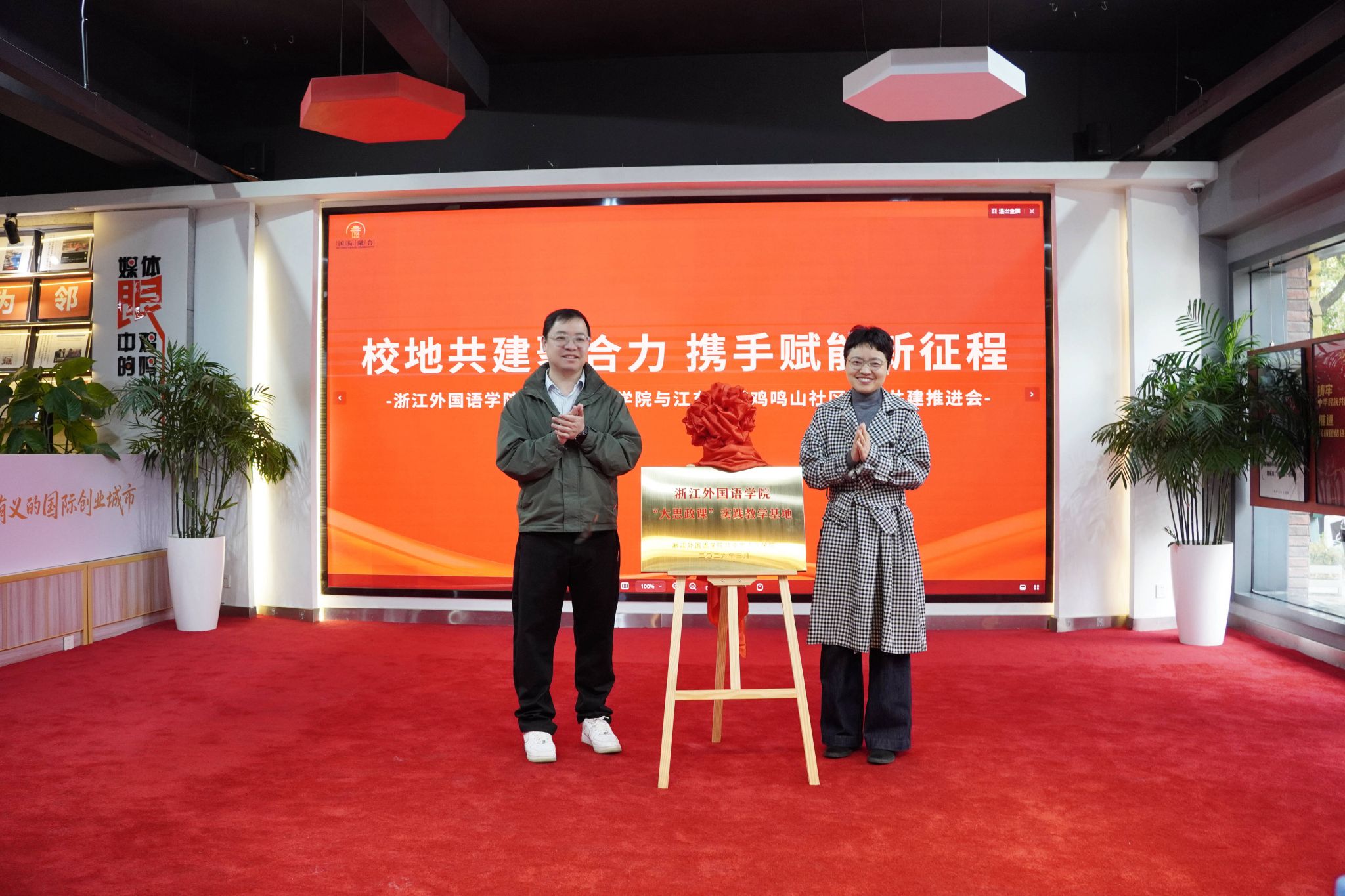 3月17日,马克思主义学院赴义乌市江东街道鸡鸣山社区开展调研对接活动,双方共同为浙江外国语学院马克思主义学院“大思政课”实践教学基地举行揭牌仪式。