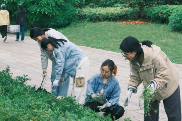 同样的触动也发生在校园的另一角。阴雨天气里,2025级会展专业学生汪兴碟蹲在草丛边清理落叶和杂物,草叶上的水珠很快打湿了她的裤脚和手套。“亲身体验后,才真正懂得一草一木都需要用心呵护。”她说。