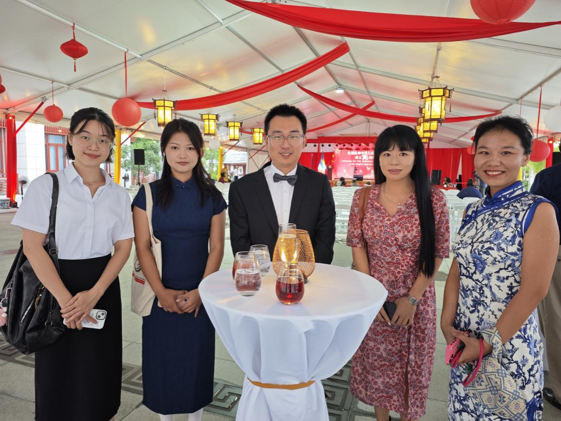 9月23日,赤几孔院中方院长李执桃带领中文教师参加中国驻赤几大使馆举办的国庆暨中赤几建交55周年招待会。使馆临时代办姜涵参赞与赤几外交部常务副部长翁多分别致辞,回顾两国友好合作历程。在文化表演环节,孔院下属CANIGE小学学生演唱中文歌曲《我的好妈妈》,展现了中文教学与文化融合的成果。三位新任志愿者教师表示,此次活动加深了她们对“民间使者”使命的理解,激励她们为推动中赤友好贡献力量。