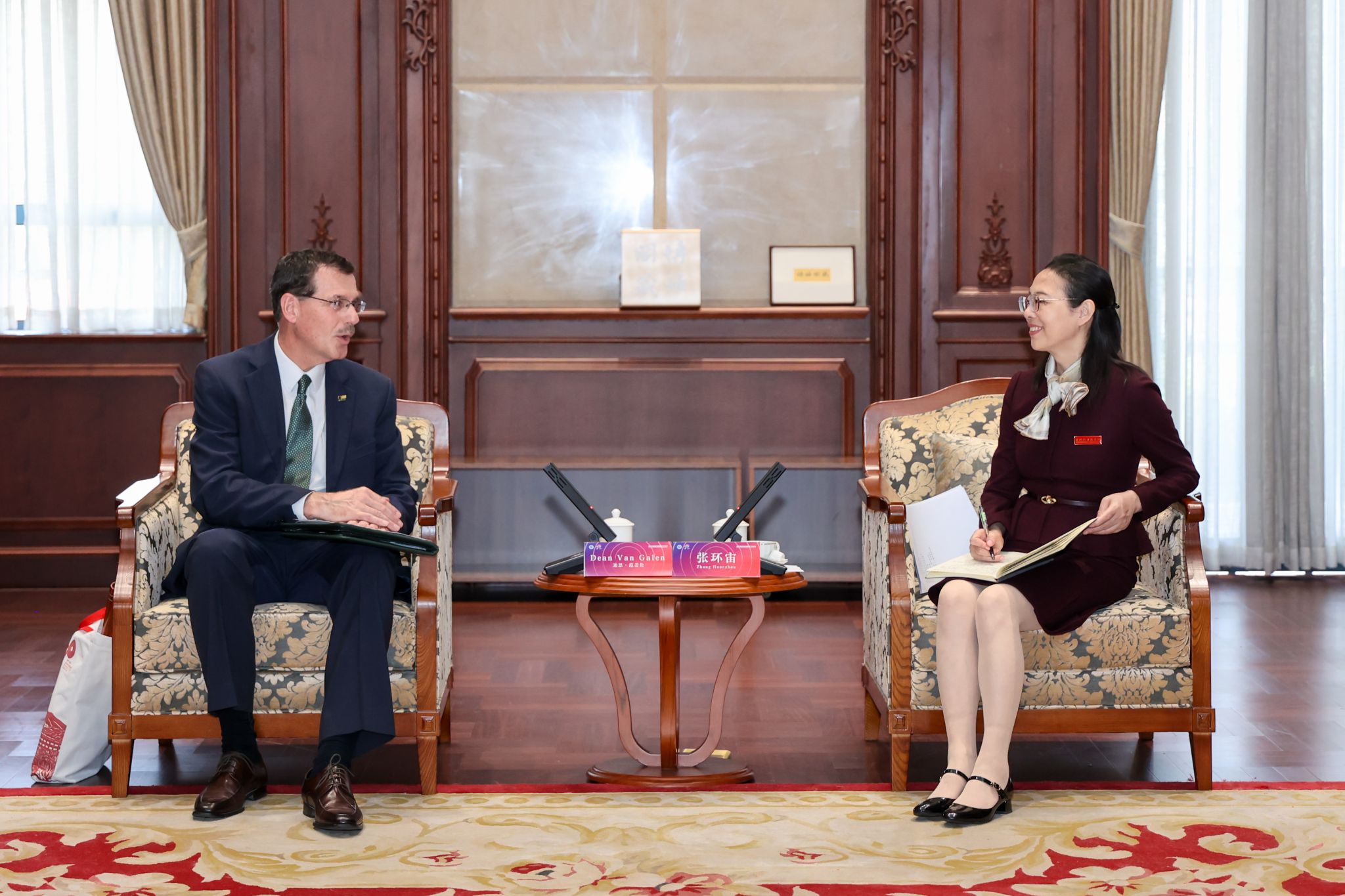 张环宙对范盖伦过去十五年卓有成效地支持参与中美教育交流表示赞赏,对其作为海外院校代表在学校建校七十周年高质量发展大会上的视频致辞表示感谢。她指出,中美人文交流的根基在民间,核心在教育,关键在青年。期待两校作为核心合作伙伴开展机制化合作,积极共建青年交流联合平台、打造人才培养的多元合作模式、推动“校地联动”服务民间交流,以“战略互信”为基础,以“长远共赢”为目标,让两校合作成为中美地方高校合作的“标杆”,让教育的力量为中美关系发展注入持久活力。